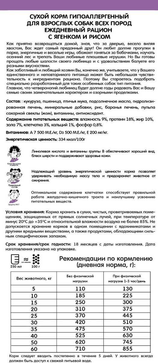 - Вызывает аллергические реакции (отиты, выпадение шерсти) у отдельных собак с непереносимостью птицы.