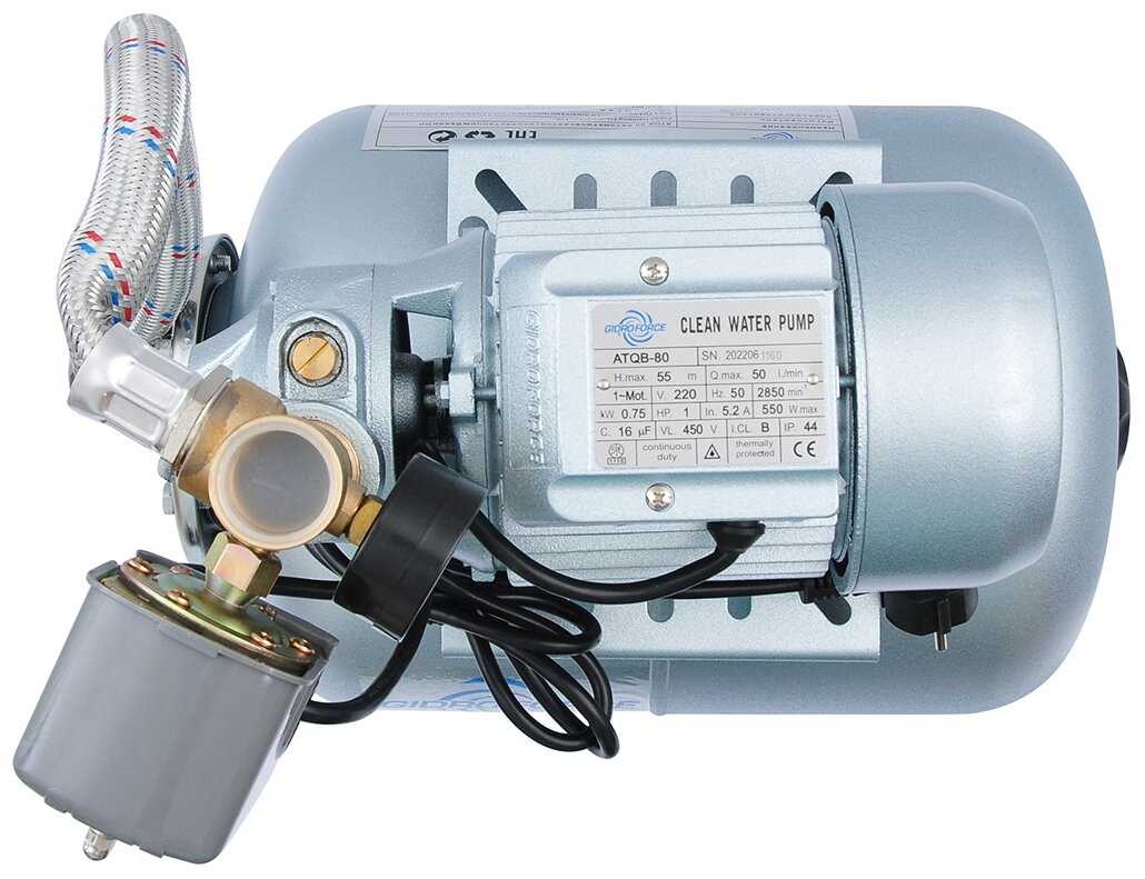 GIDRO FORCE Насосная станция GIDROFORCE ATQB80, доп. воронка и сальник (чугун, мощность всасывания 1050 В, подача воды 50 л/мин, напор 55 м, гидробак 24 л)2102 место из 7573 Характеристики:- тип: поверхностная насосная станция
