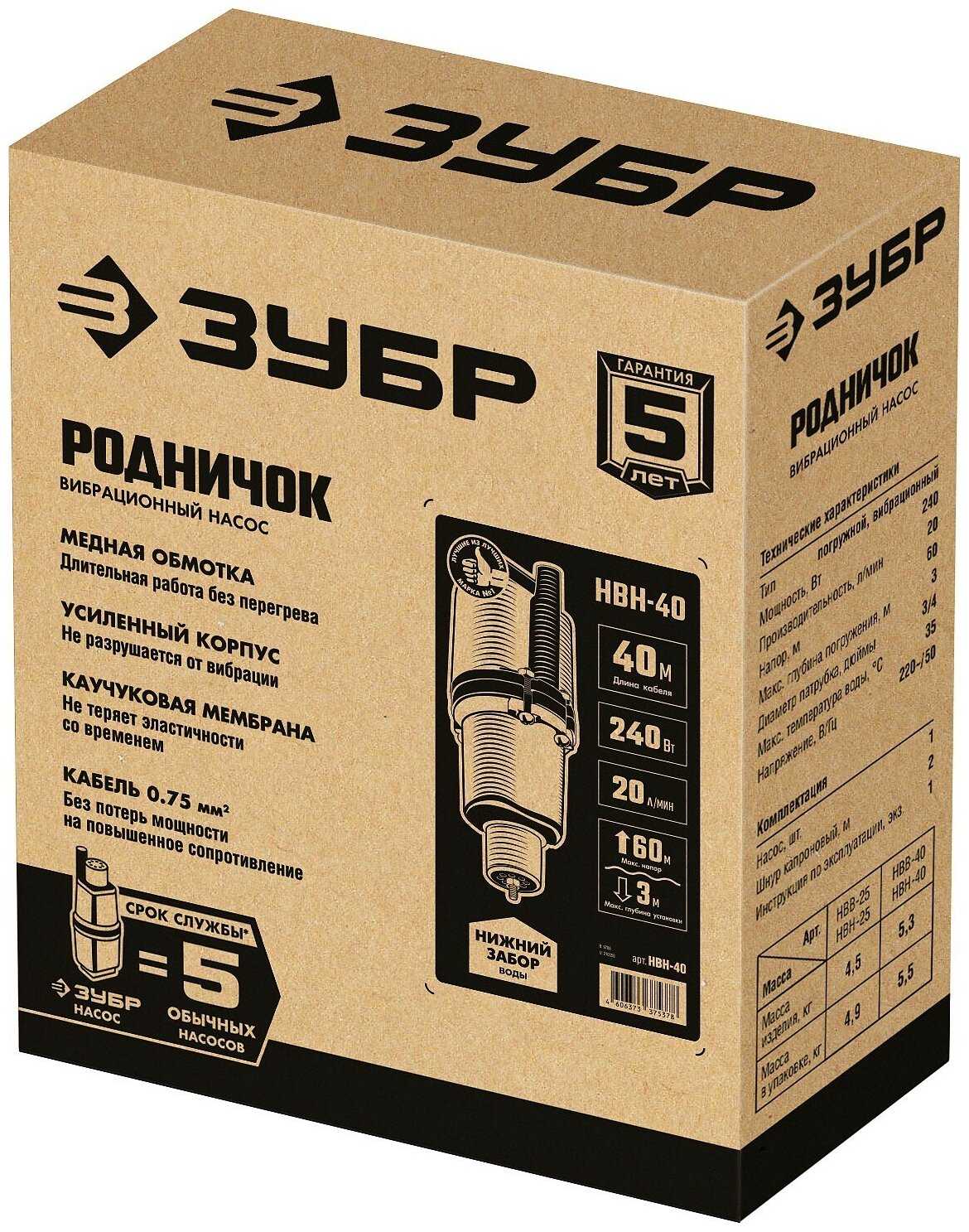 ЗУБР 40 м провод, с нижним забором воды, насос вибрационный Родничок-Н НВН-40 Мастер