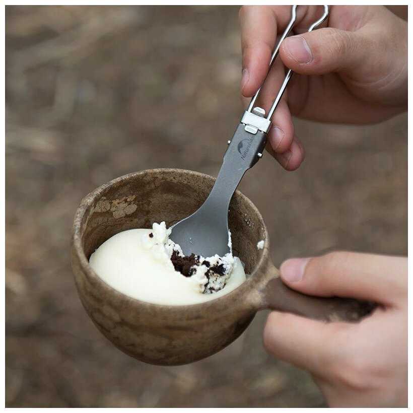 На этикетке товара написано: изготовлено из титанового сплава и нержавеющей стали. Можно сделать вывод, что раскладная ручка сделана не из титана, а из нержавейки. Размер 16,2 х 3,3 см, немногим больше чайной ложки. На несколько грамм легче ложки из нержавейки. Абсолютно неразумная трата денег (на момент покупки стоила около 1000р)