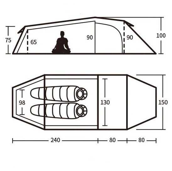 Ну вот нашли эту... Будем посмотреть. У меня рост 183, сидя на попе голова упирается в потолок внутренней палатки даже в самой высокой ее части. К ногам палатка сужается, так что два прямоугольных коврика в нее вряд ли поместятся.