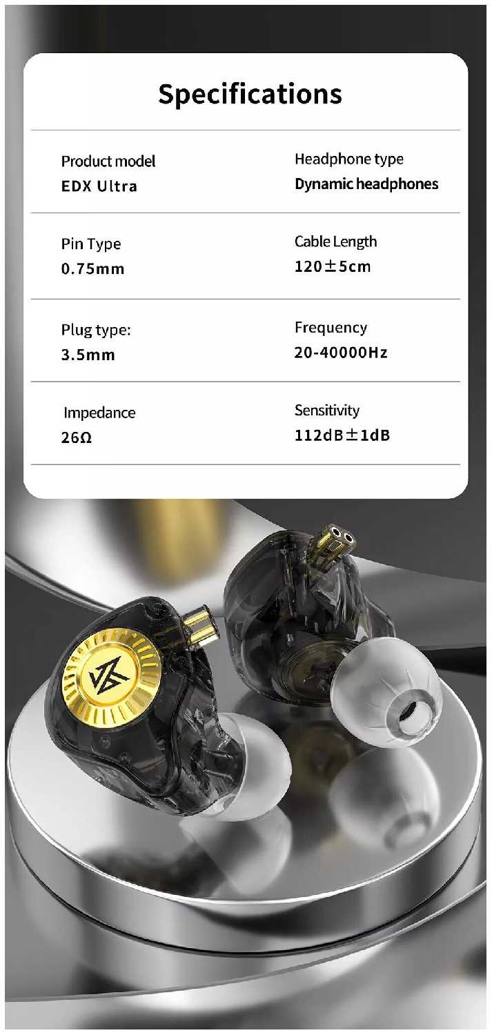 Knowledge Zenith Спортивные игровые проводные наушники KZ EDX-Ultra HIFI с бассами, шумоподавлением и микрофоном - черные