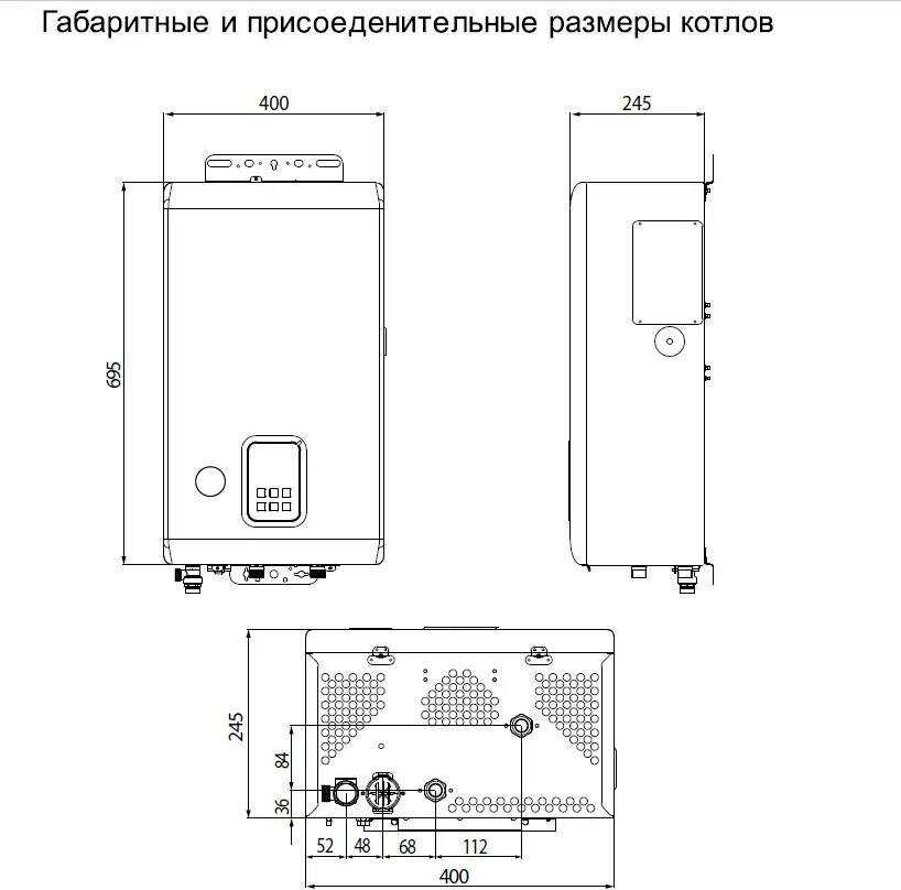 | Особенности : | воздухоотводчик, встроенный расширительный бак, встроенный циркуляционный насос, манометр, предохранительный клапан, разъем для подключения внешнего управления, термометр |