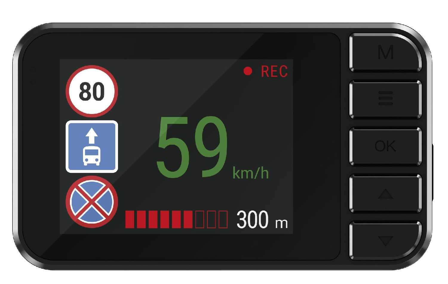 - Звуковые оповещения о превышении скорости (порог настраивается) и приближении к камерам.