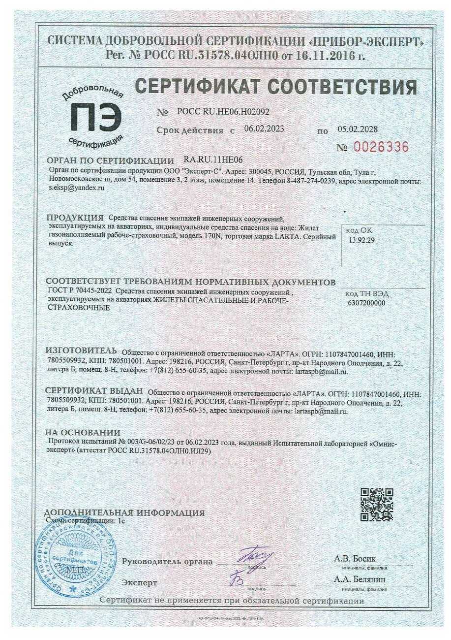 Характеристи Не определен Надувной (автоматический) газонаполняемый спасательный жилет LARTA 170N