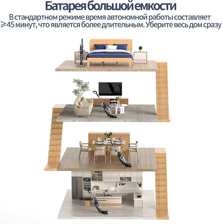 - Беспроводное использование: заряда аккумулятора достаточно для уборки 60-70 м² в стандартном режиме (до 30-40 минут работы).