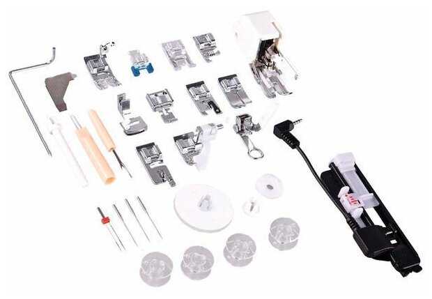 Стандартная комплектация включает 11-15 различных лапок, среди которых лапка для молнии, шагающая лапка, лапка для петель и другие специализированные варианты. Также в набор входит приставной столик для увеличения рабочей поверхности, дополнительный стержень для шитья двойной иглой, машинное масло и вспарыватель шва. Такой богатый комплект избавляет от необходимости сразу докупать дополнительные аксессуары. -