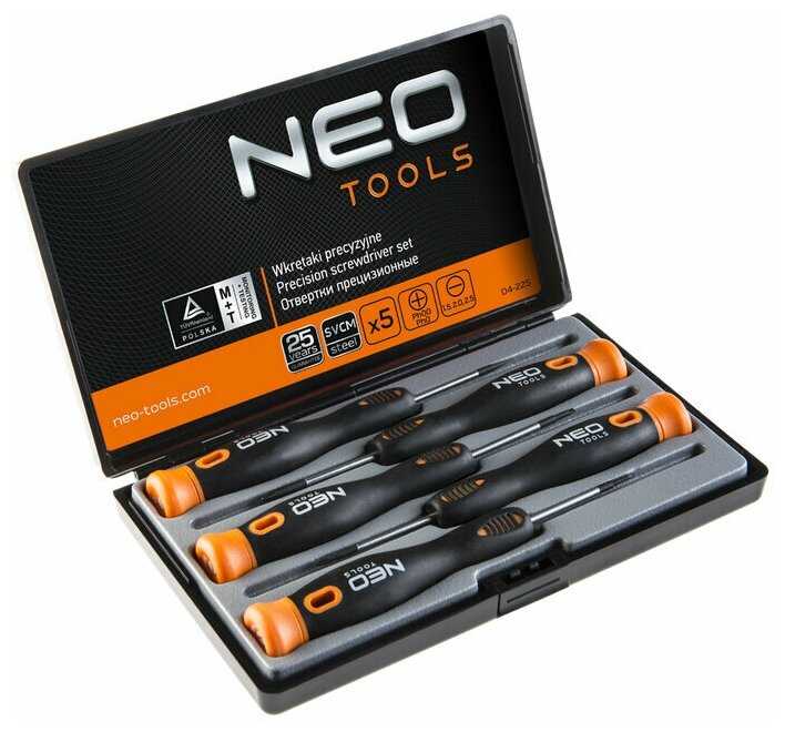 В наборе 3 шлицевые и 2 крестовые отвёрки. Рабочая часть закаленная, износостойкая. Ручки из приятного материала "софт тач", навершие вращающееся, руку натирать не будет. Хороший вариант для точных работ. Не рекомендую применять силу при работе, всё таки данный инструмент создан не для этого. Коробка прочная, пластик толстый, нормальные петли, нормальная защелка. Присутствует облой и следы плавки, но это чисто вопрос эстетики, на работу не влияет. Использовал подобные отвертки данного производителя и раньше, в работе показали себя отлично и надежно. Конечный товар в моём случае отличался от изображения на фото. Мои имеют черные рукоятки, а не зеленые. Не критично.