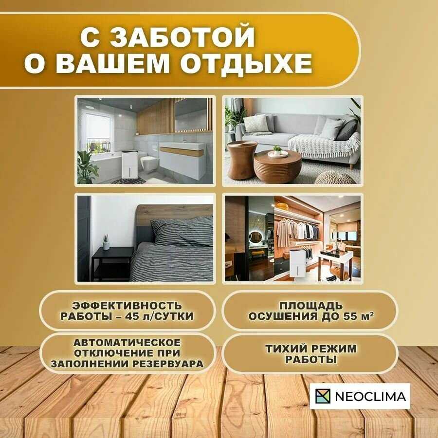 - Эффективно снижает влажность с 80-90% до 40-50% за несколько часов работы в помещениях площадью 15-30 м².