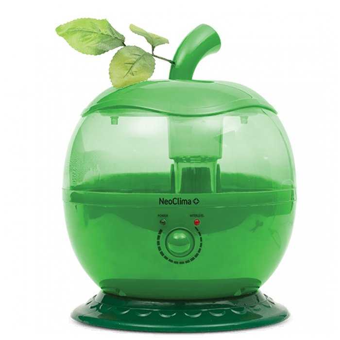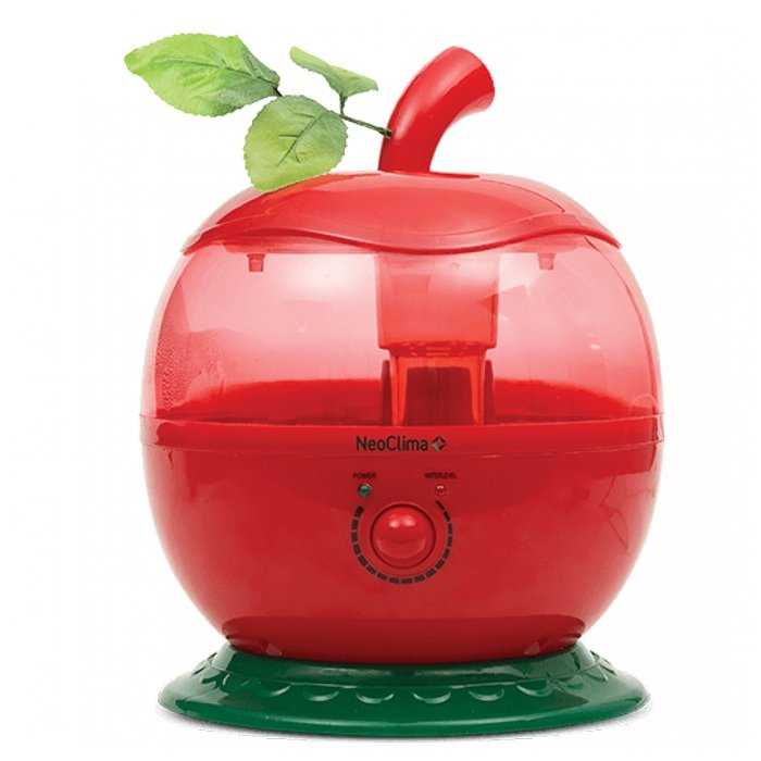 - Форма «яблока» с декоративными листиками и зелёным корпусом эстетично вписывается в интерьер, особенно в детских.