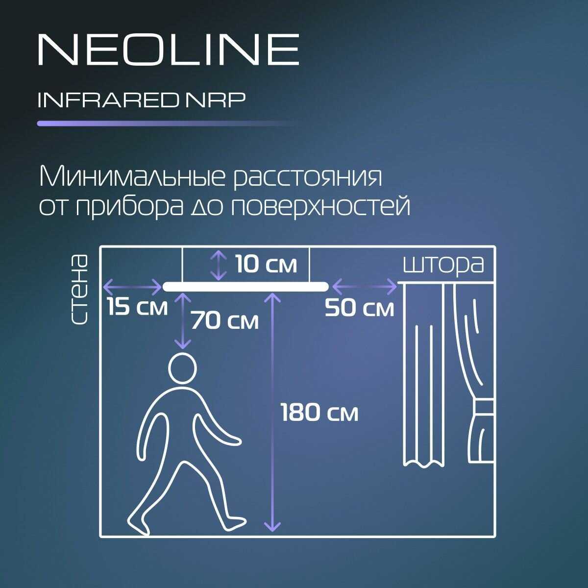 Требуется зазор не менее 5 см между корпусом и потолком/стенами, особенно для натяжных потолков. Корпус сильно нагревается, и при близком размещении возможен перегрев или повреждение поверхностей. Пользователи предупреждают, что стоять непосредственно под устройством долго некомфортно из-за интенсивного теплового излучения. -