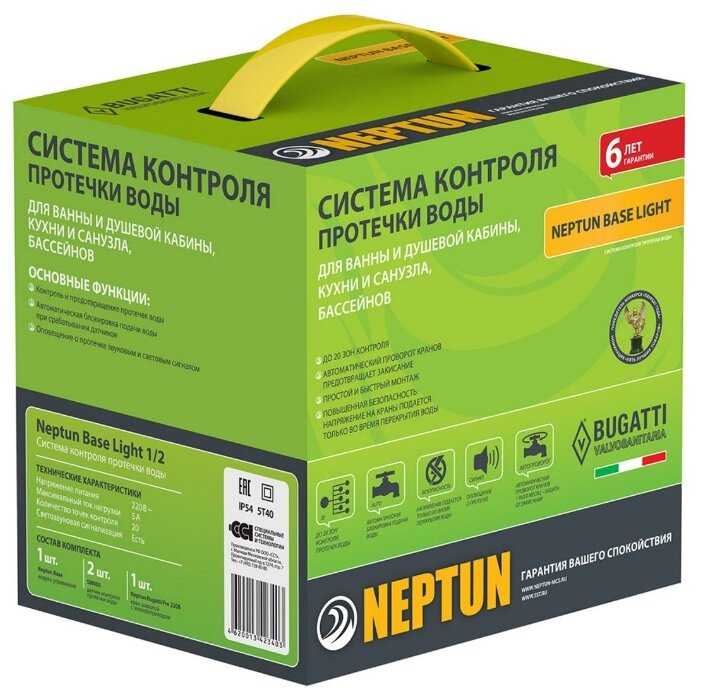 | Подробная комплектация : | модуль управления Neptun Base - 1 шт., датчик Нептун SW 005 2.0 - 2 шт., кран шаровый с электроприводом Bugatti Pro 220В ½ - 1 шт. |