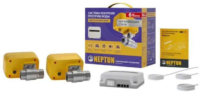 | Подробная комплектация : | датчики контроля протечки воды SW005 3 шт., кран Neptun Profi 220В 2 шт., модуль управления Neptun Base |