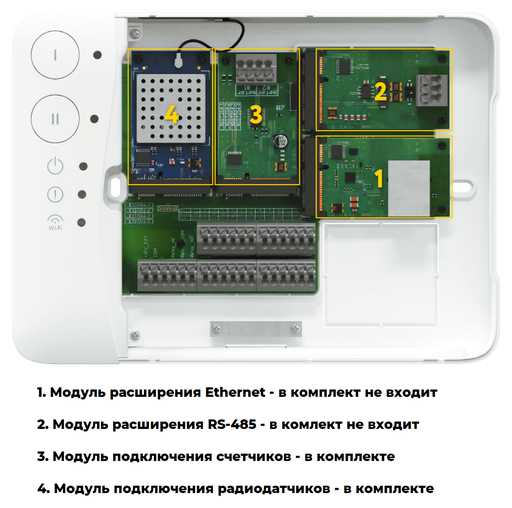 - Поддержка мониторинга счетчиков воды через доп. плату.