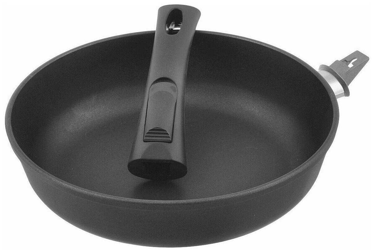 - Съёмный механизм упрощает хранение: сковорода занимает меньше места, а ручку можно использовать для других моделей серии.