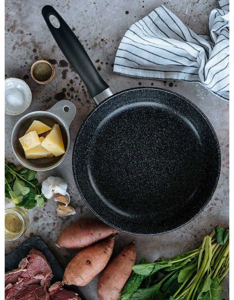 - Подходит для жарки стейков, выпечки блинов и тушения овощей благодаря оптимальной глубине (4–5 см).