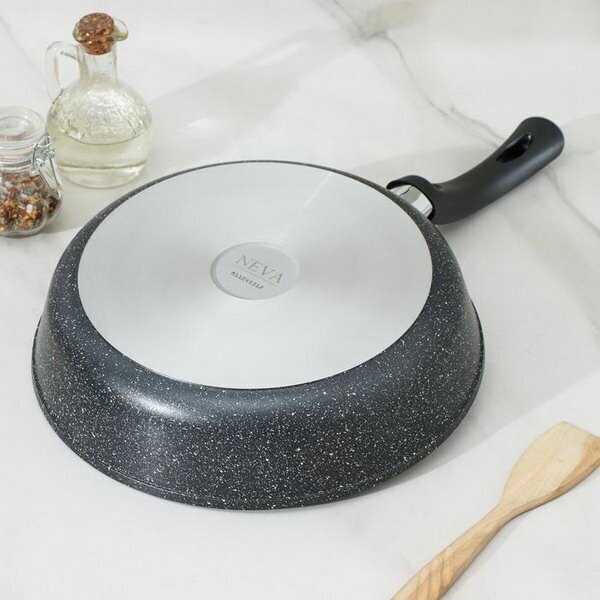 Пользователи единогласно подтверждают высокую эффективность антипригарного покрытия сковородок Neva Granit при жарке и тушении. Основное преимущество — возможность готовить с минимальным количеством масла благодаря равномерному прогреву толстого дна и стенок. Многие отмечают формирование идеальной золотистой корочки на продуктах, особенно при жарке стейков, картофеля и блинов. Глубокие бортики (до 7-8 см) расширяют функционал: в сковородах удобно тушить объемные блюда. Однако часть пользователей столкнулась с дефектами покрытия: у 5% рецензентов оно вздулось пузырем после первого использования, а у 15% начало отслаиваться через 2-6 месяцев активной эксплуатации.