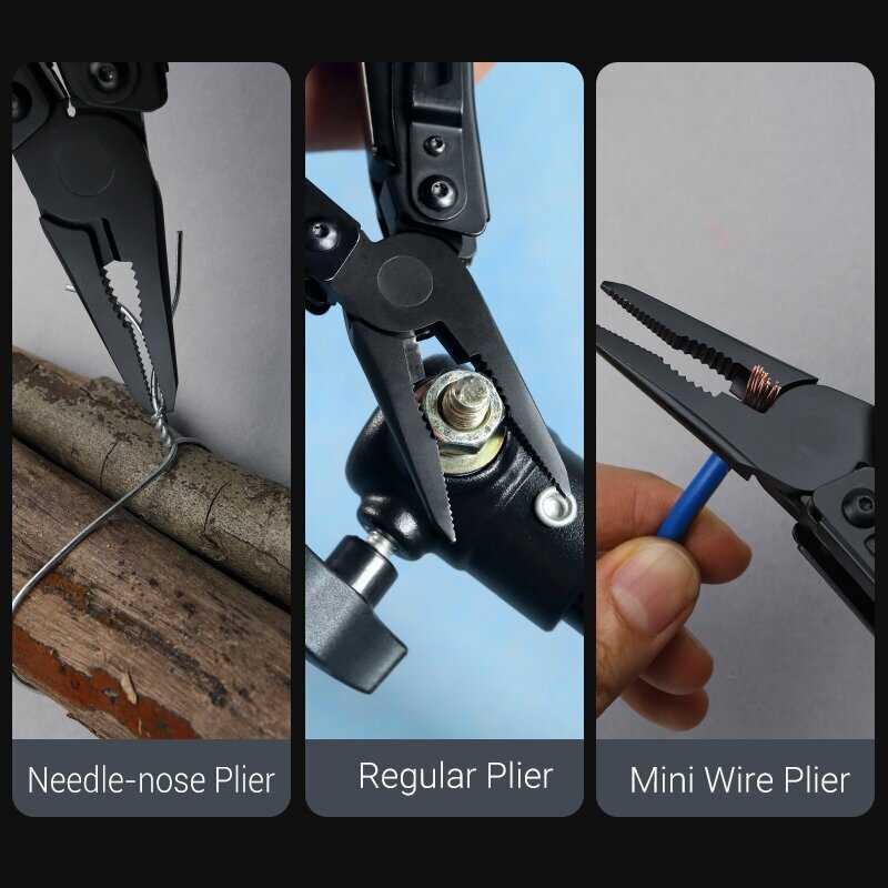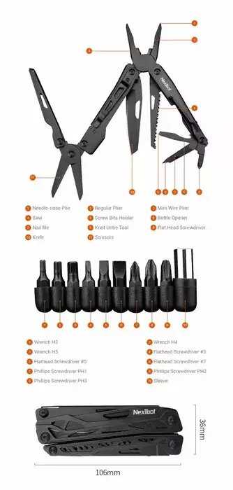 Инструменты (функции) : | открывалка для бутылок, пила, сменные биты, нож, кусачки, пассатижи, гаечный ключ, ножницы, отвертка, огниво, захват для гаек, плоскогубцы |
