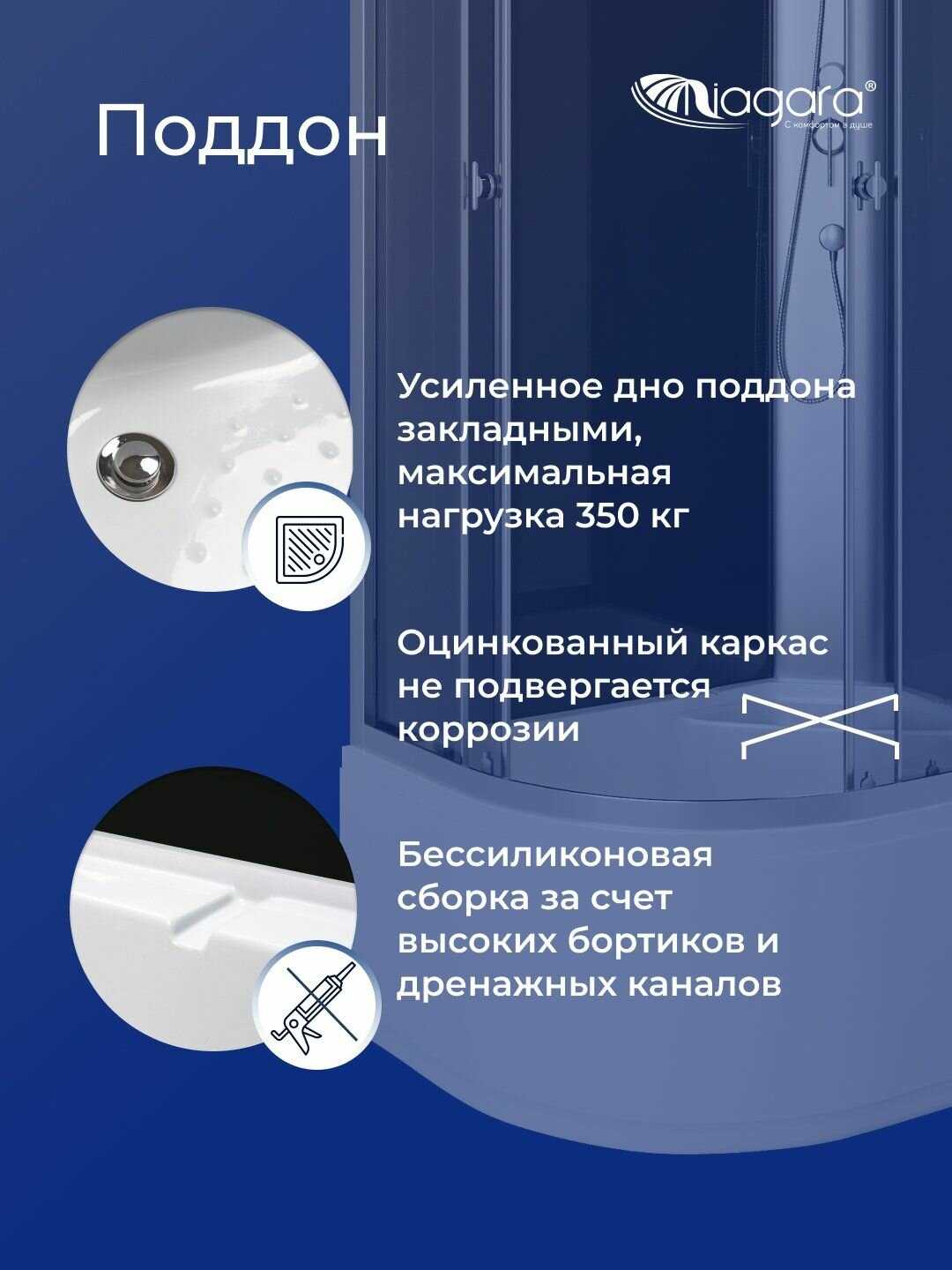 - - очень слабая конструкция, заявлен усиленный поддон по факту это не так, все надо подгонять и подрезать, тропический душ сломался после пары использования, пришлось менять лейку