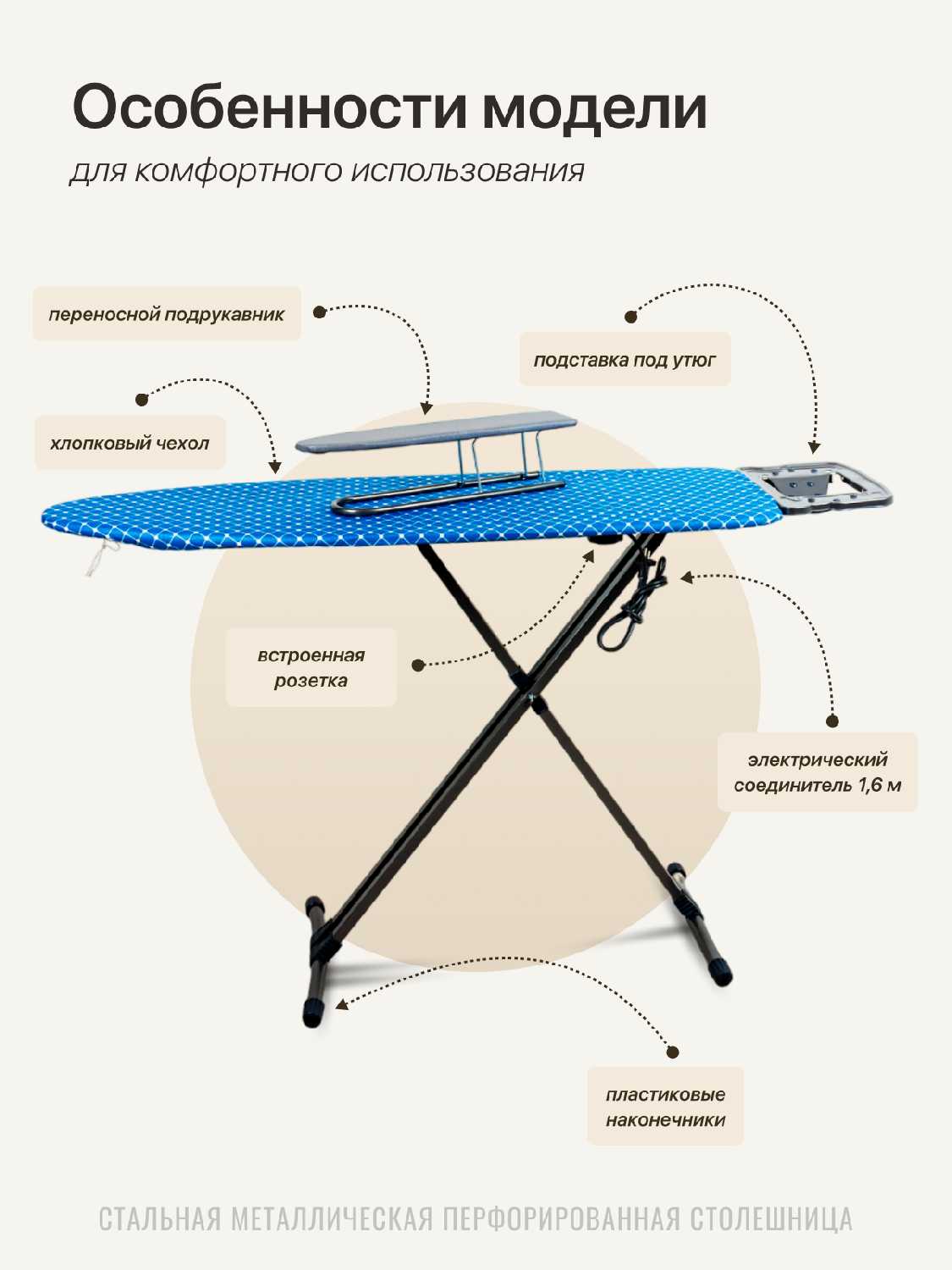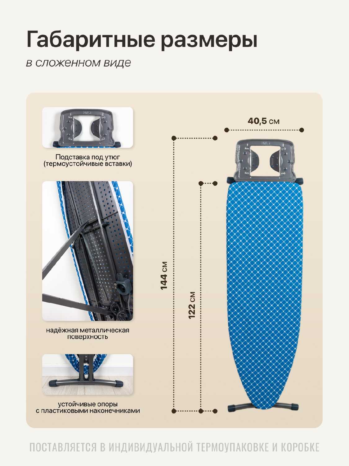 - Массивные ножки предотвращают опрокидывание даже при интенсивной работе с тяжелым утюгом или парогенератором.