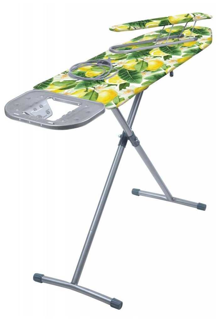 - + Металлическая основа, легко складывается, розетка с удлинителем, гладильный рукав