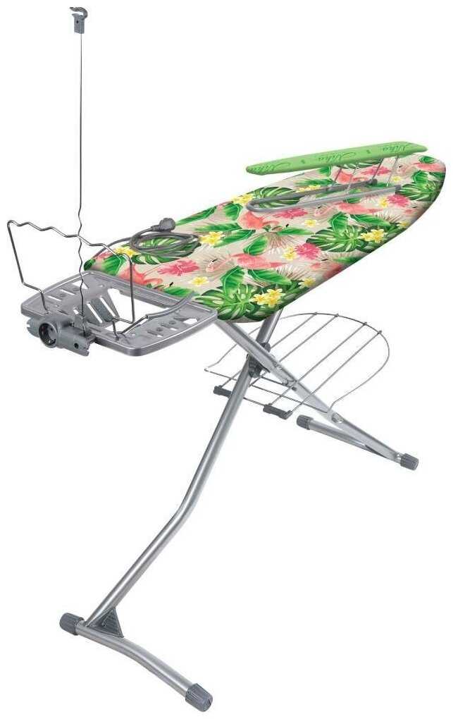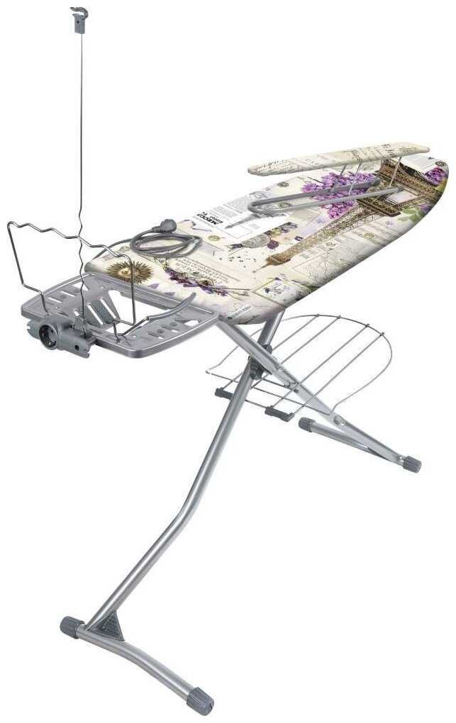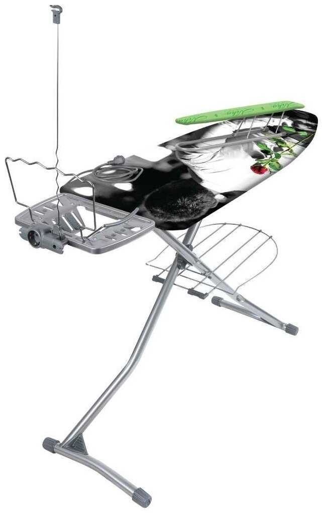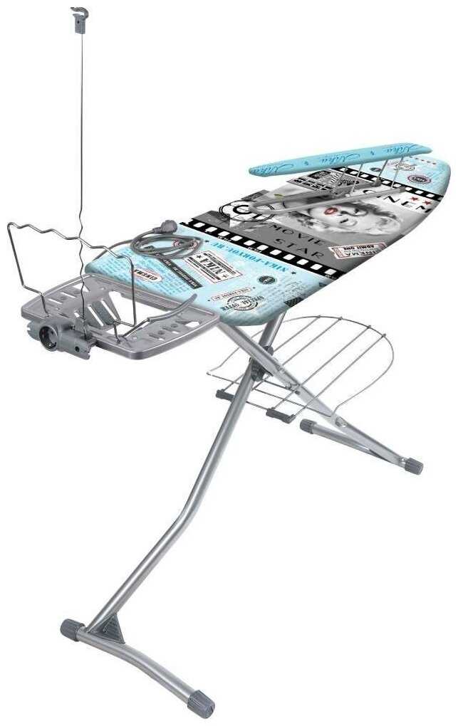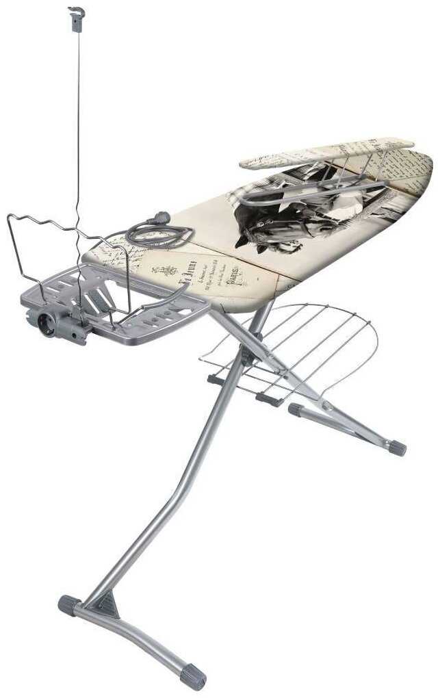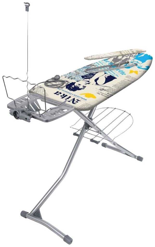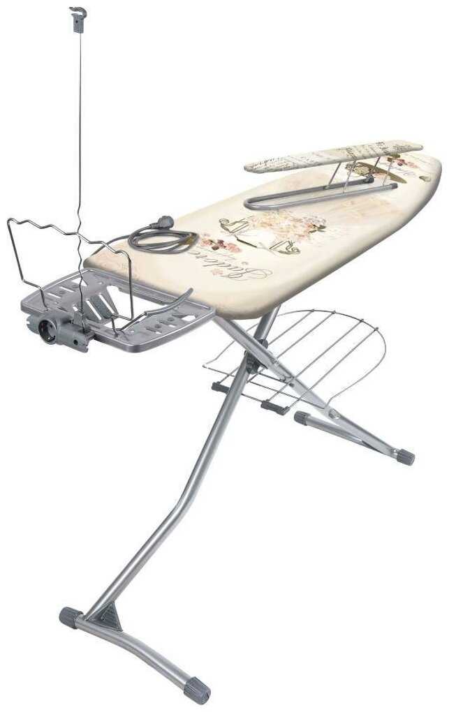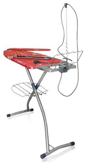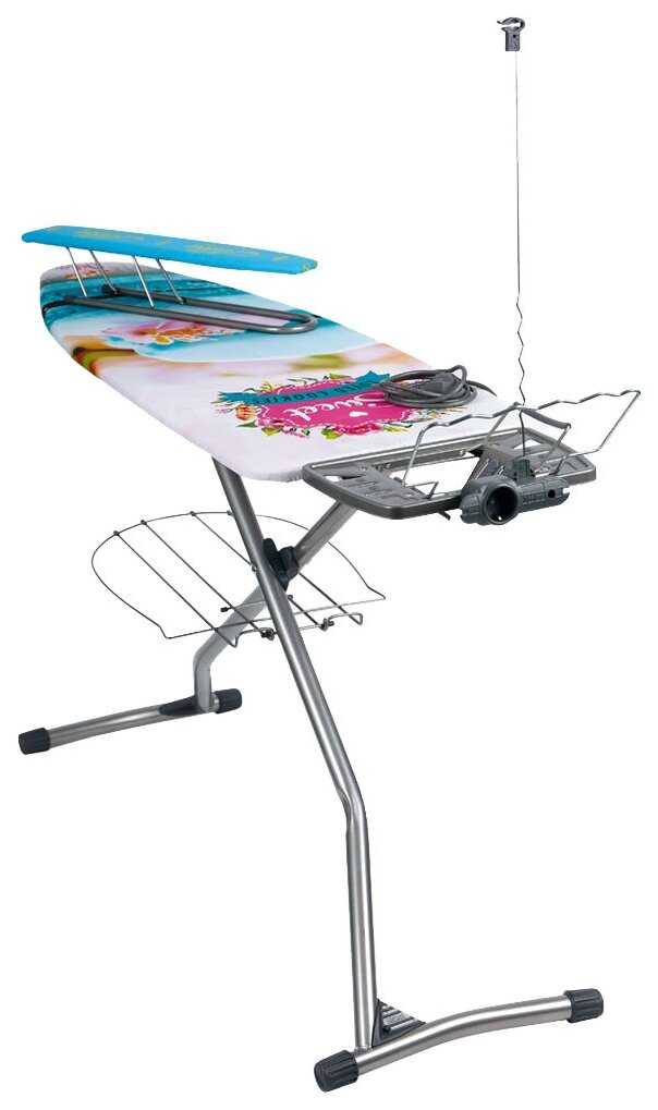 - + огромная, высота регулируется в несколько положений. подставка под бельё внизу. держатель шнура, встроенный удлинитель, удобная подставка под утюг.