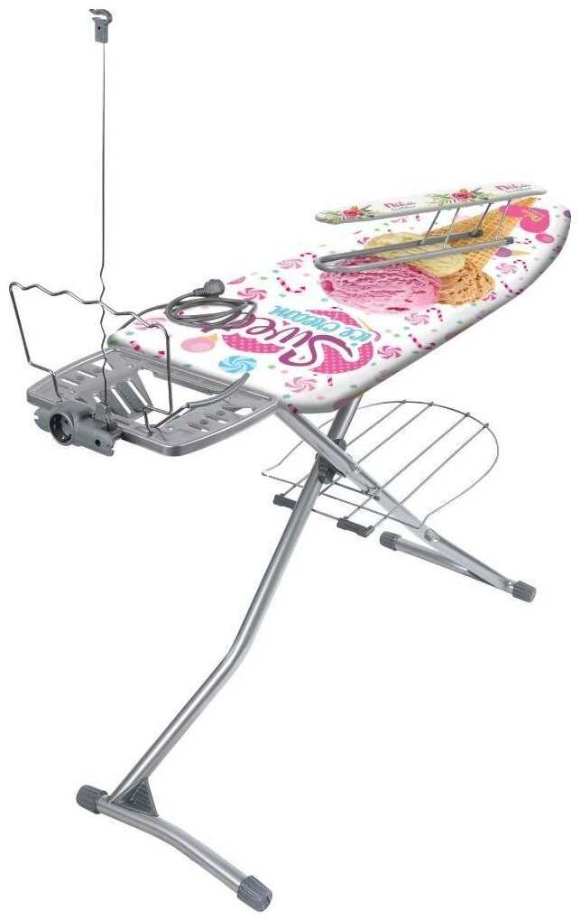 Широкая, удобная подставка для утюга, удлинитель хороший, не короткий, держатель для шнура и полочка для глаженного белья.