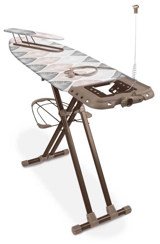 В комплекте есть съемная доска для рукавов, подставка под утюг с термостойким покрытием, держатель для шнура и полочка для белья. Подставка удерживает утюг от падения, а полочка выдерживает до 10 кг, что позволяет использовать ее для парогенератора. -
