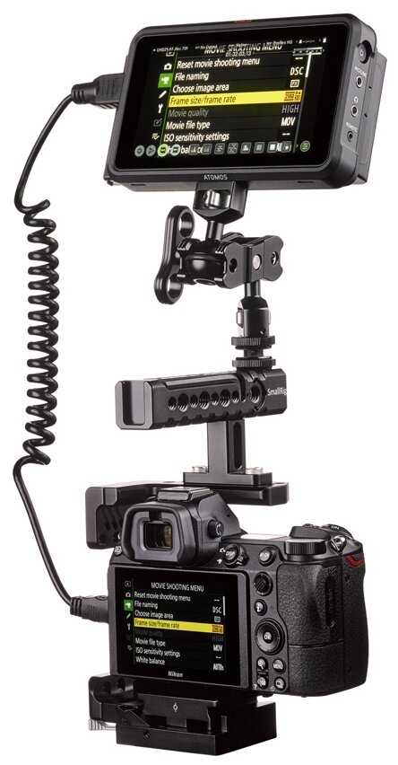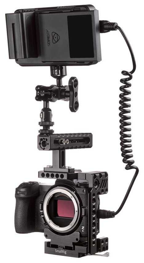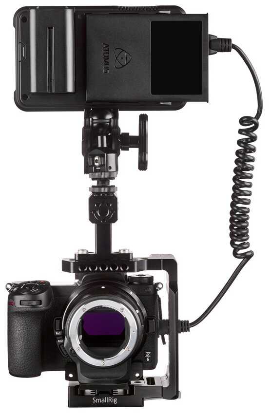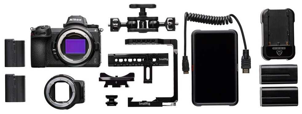 aотокамера Nikon Z6, защитная крышка BF-N1, резиновый наглазник DK-29 (поставляется прикрепленным к фотокамере), зарядное устройство для батареи MH-25a, ремень AN-DC19, зажим кабеля HDMI/USB, кабель USB UC-E24, крышка башмака для принадлежностей BS-1, переходник байонета FTZ, рекордер Atomos Ninja V, крепление SmallRig, две аккумуляторные батареи EN-EL15b, витой кабель HDMI, две аккумуляторные батареи для рекордера 5200 мАч, верхняя рукоятка SmallRig для крепления фотокамеры, кронштейн SmallRig Magic Arm