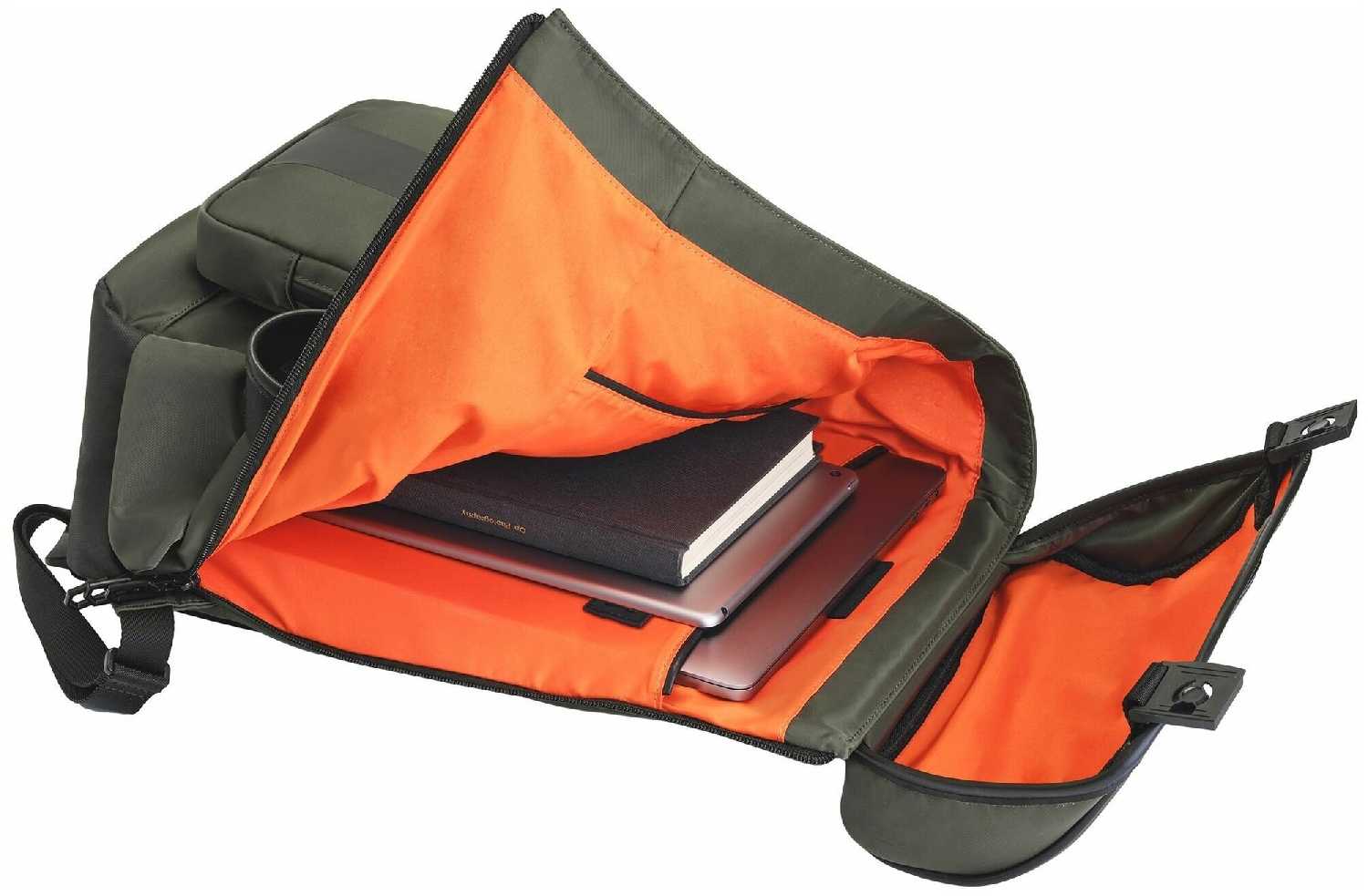 - + Хорошая ткань. Удобный фастекс, боковой карман большой. прочная стропа, швы не торчат. Цвет максимум на четверть тона тускнее, но это скорее разница с монитором, что скорее плюс, не "вырвиглазный". удобные три собачки на основном отделе.