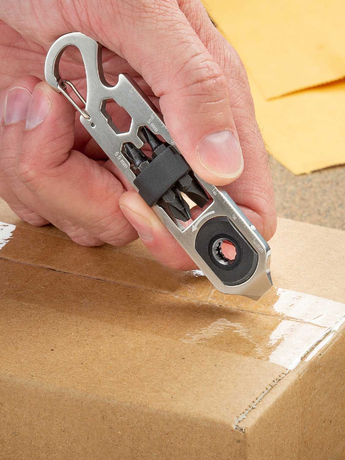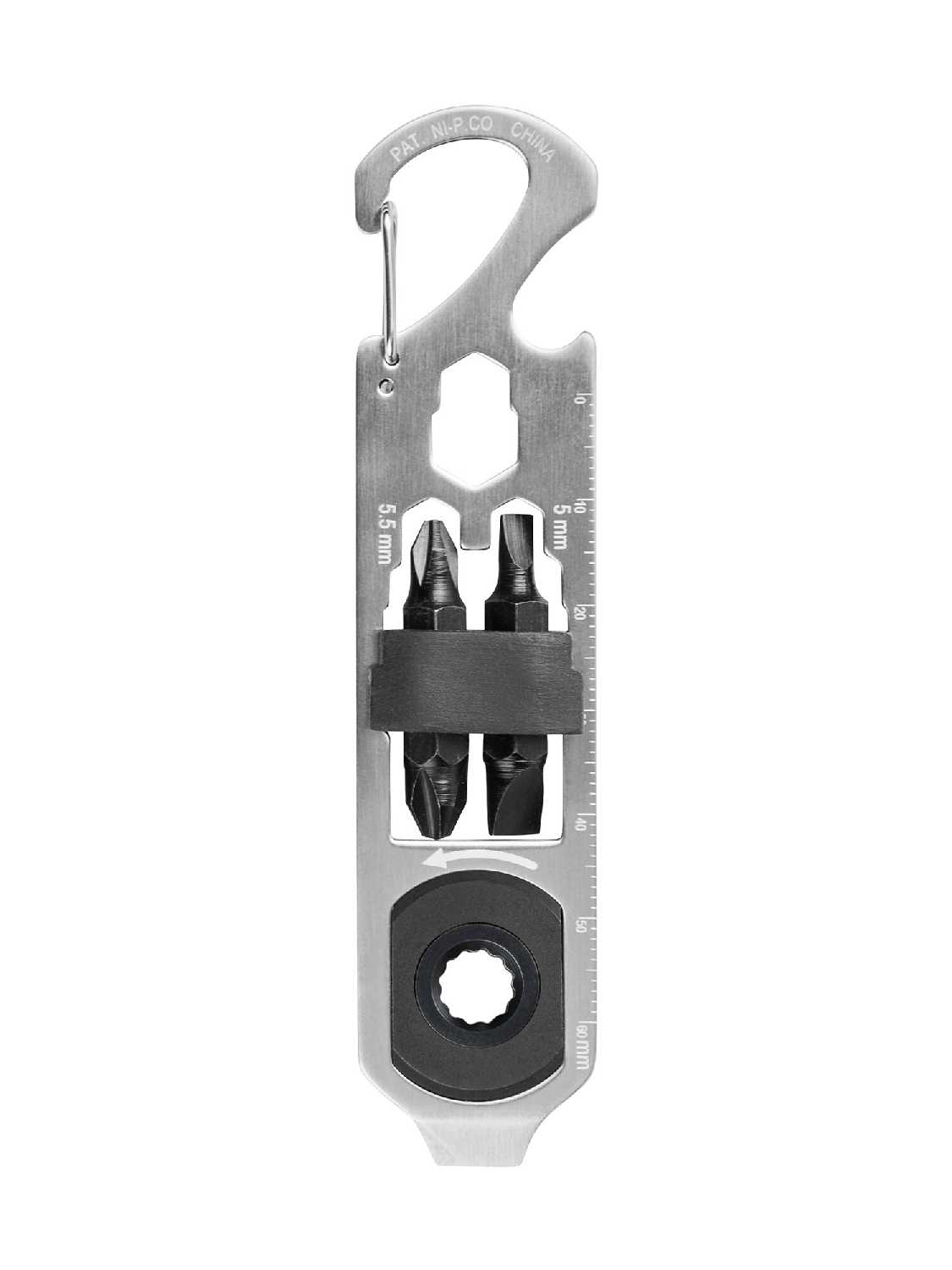 Инструменты (функции) : | гаечный ключ, карабин, линейка, нож, отвертка, открывалка для бутылок, сменные биты |