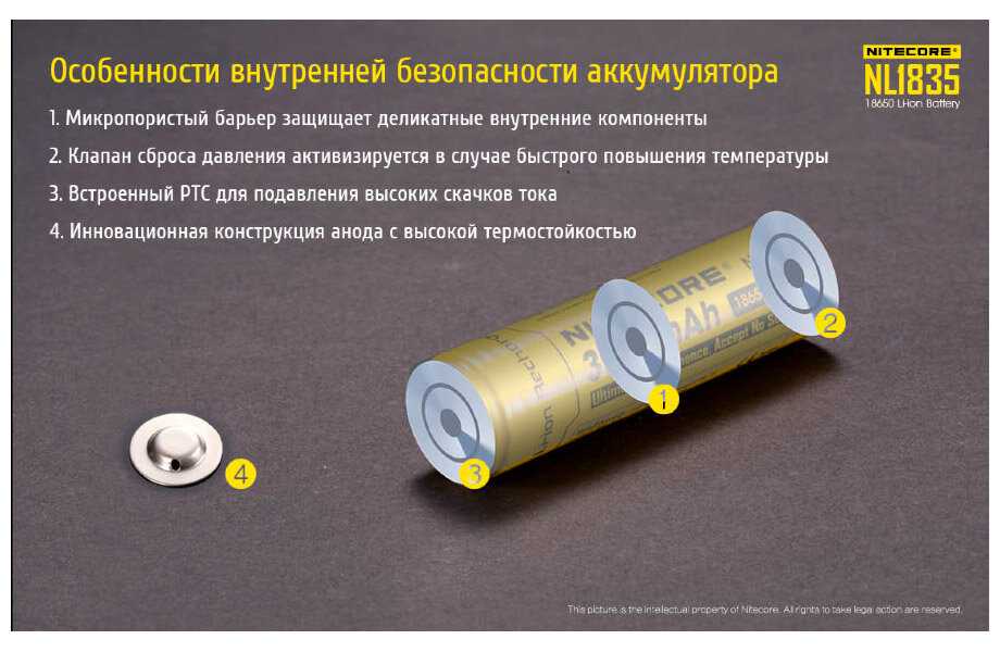 На упаковке указано наличие защиты, включая клапан сброса газа против вздутия. У оригинальных Nitecore защита видна на плюсовом контакте, здесь — не всегда проверено. Пользователи не отмечают проблем с переразрядом в использовании. Производитель заявляет о защите, но в репликах это под вопросом. Полезно для безопасности в фонарях.