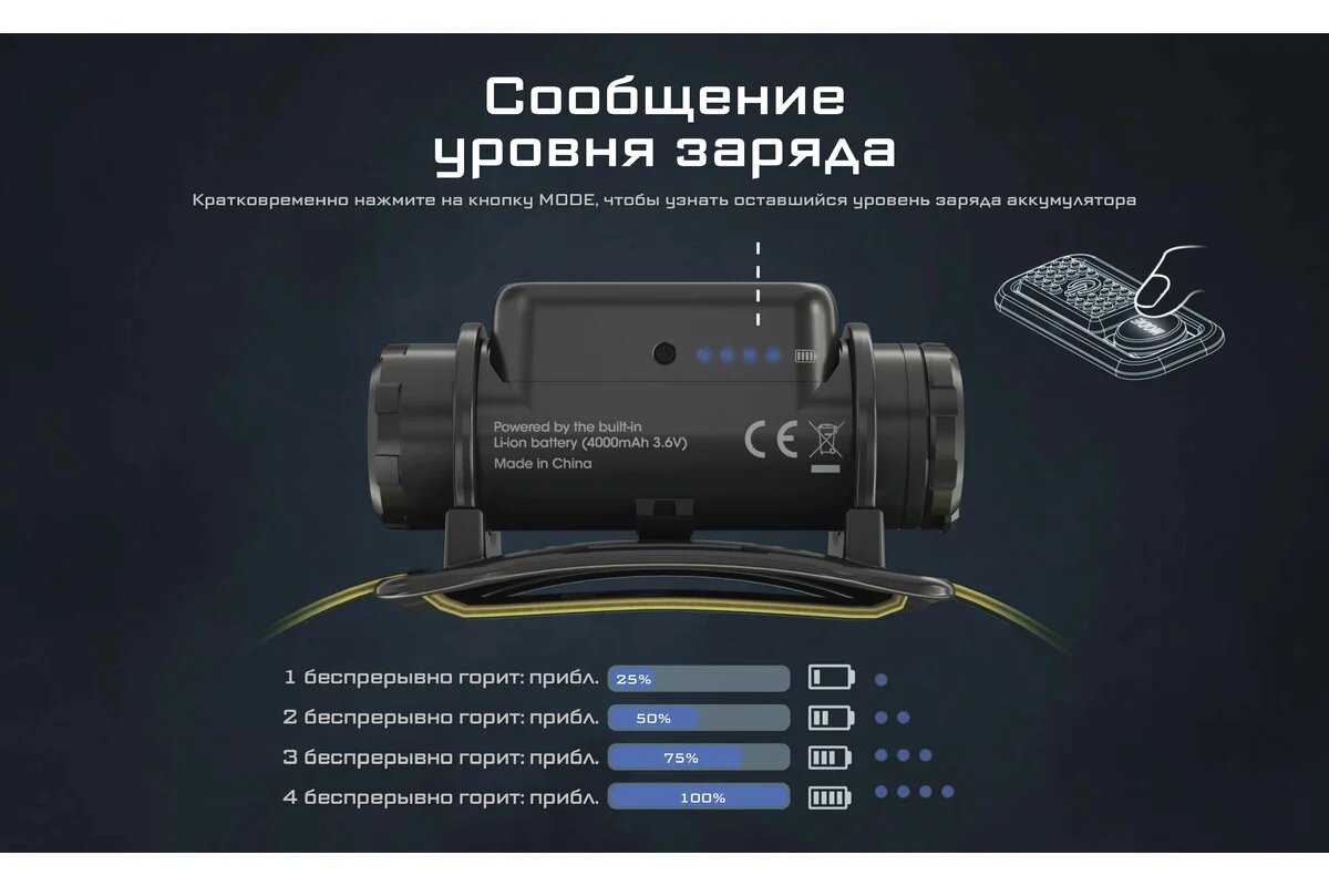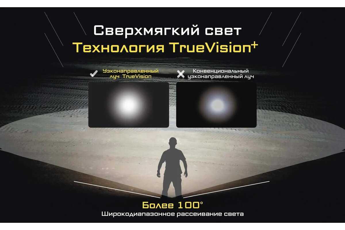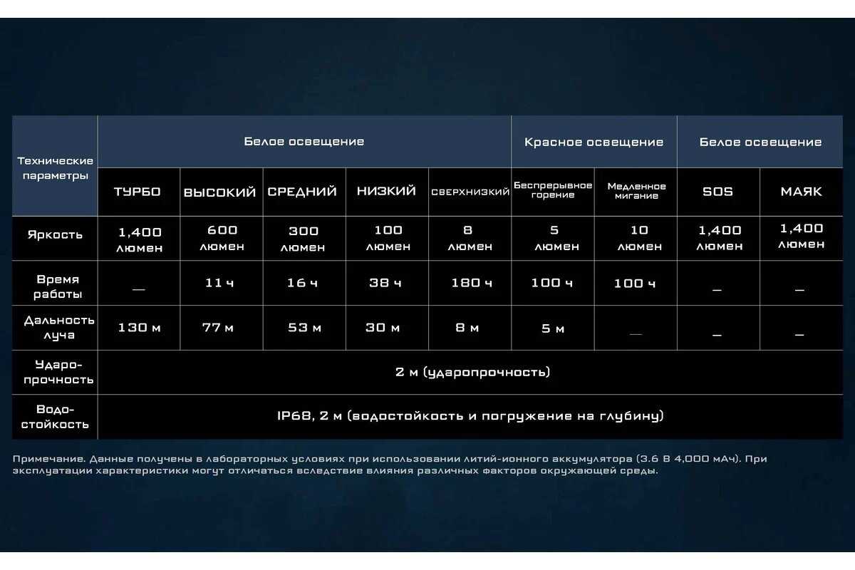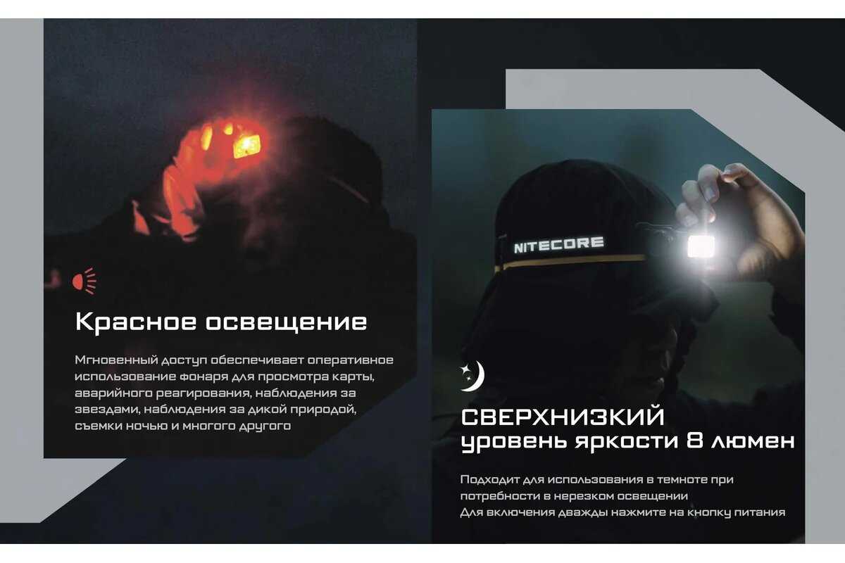 - Режим сверхнизкой яркости (1 лм) позволяет работать в полной темноте без ослепления.