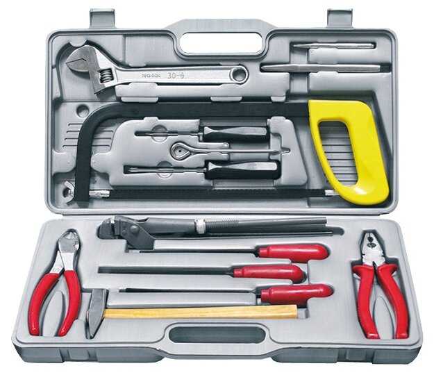| Инструменты в комплекте : | бокорезы, вороток для головок, зубила, клещи, ключ разводной, ключ трубный рычажный, ключи гаечные, ключи имбусовые (шестигранные), ключи торцевые, кусачки, молоток, напильник по металлу, ножовка по металлу, отвёртки, плоскогубцы, трещотка |