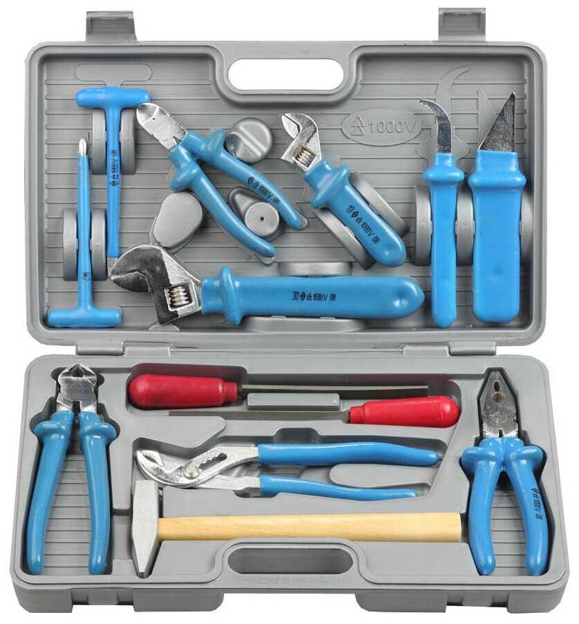 Инструменты в комплекте : | бокорезы, клещи, клещи переставные, ключ разводной, ключи гаечные, ключи торцевые, кусачки, молоток, напильник по металлу, отвёртки, пассатижи, плоскогубцы |