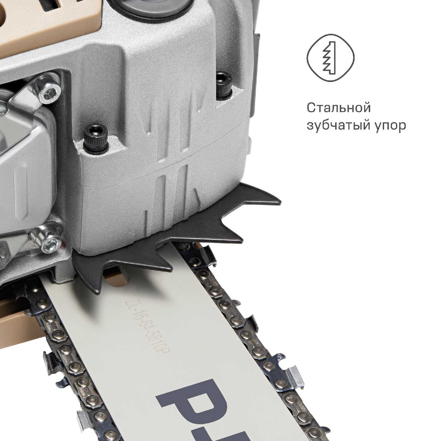 - Расположение топливного бака над двигателем создаёт естественный противовес, улучшая управляемость при вертикальном пилении.