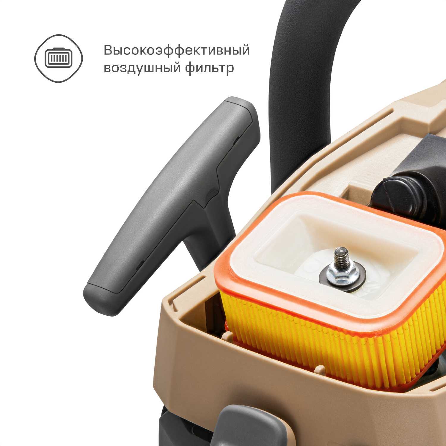 - Двухступенчатая система очистки (нейлоновая сетка + поролоновый фильтр) защищает карбюратор от стружки и пыли.