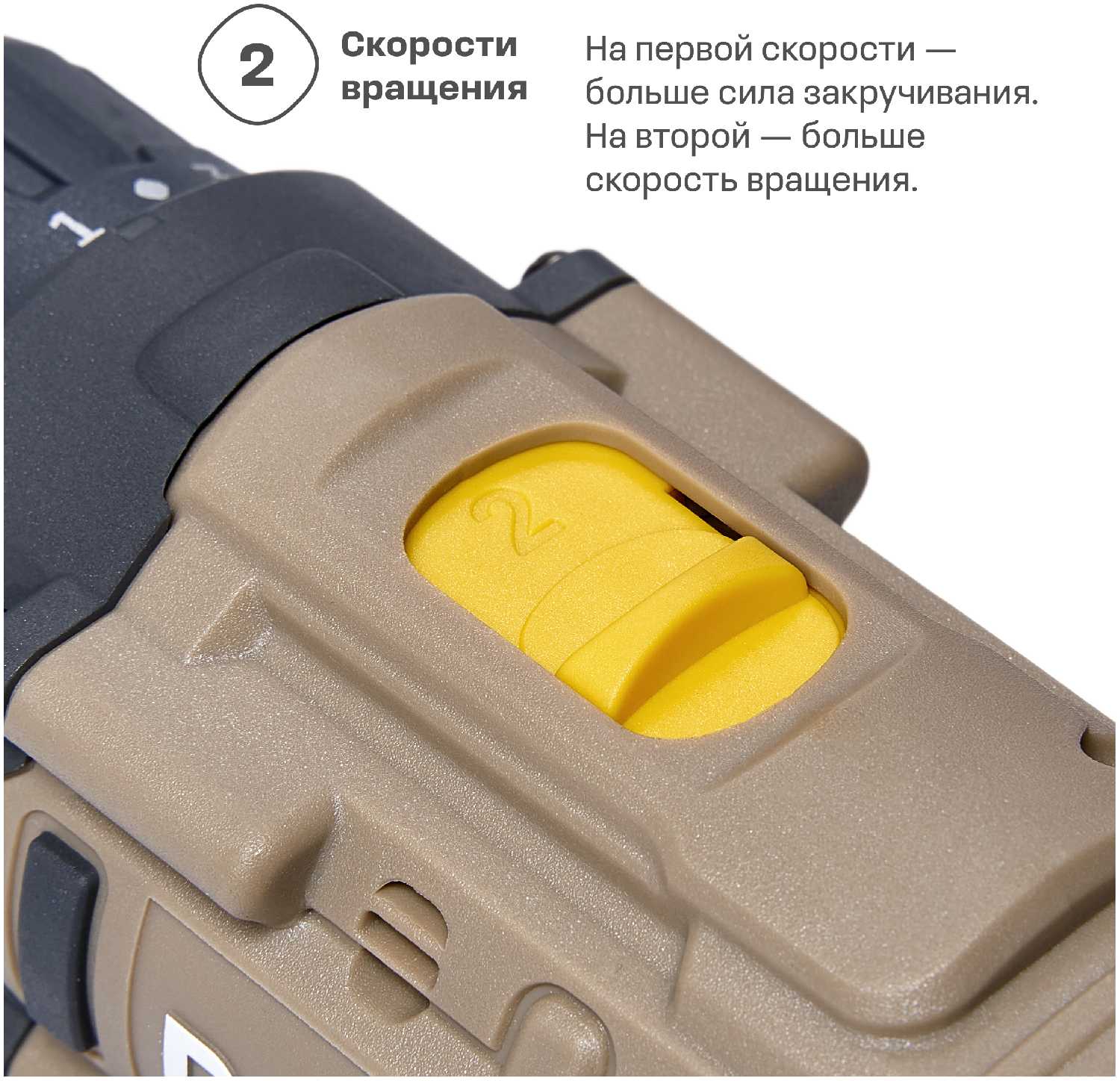 - Крутящий момент 25 Н·м (на 1 скорости) позволяет закручивать саморезы длиной до 70 мм в дерево без предварительного сверления.