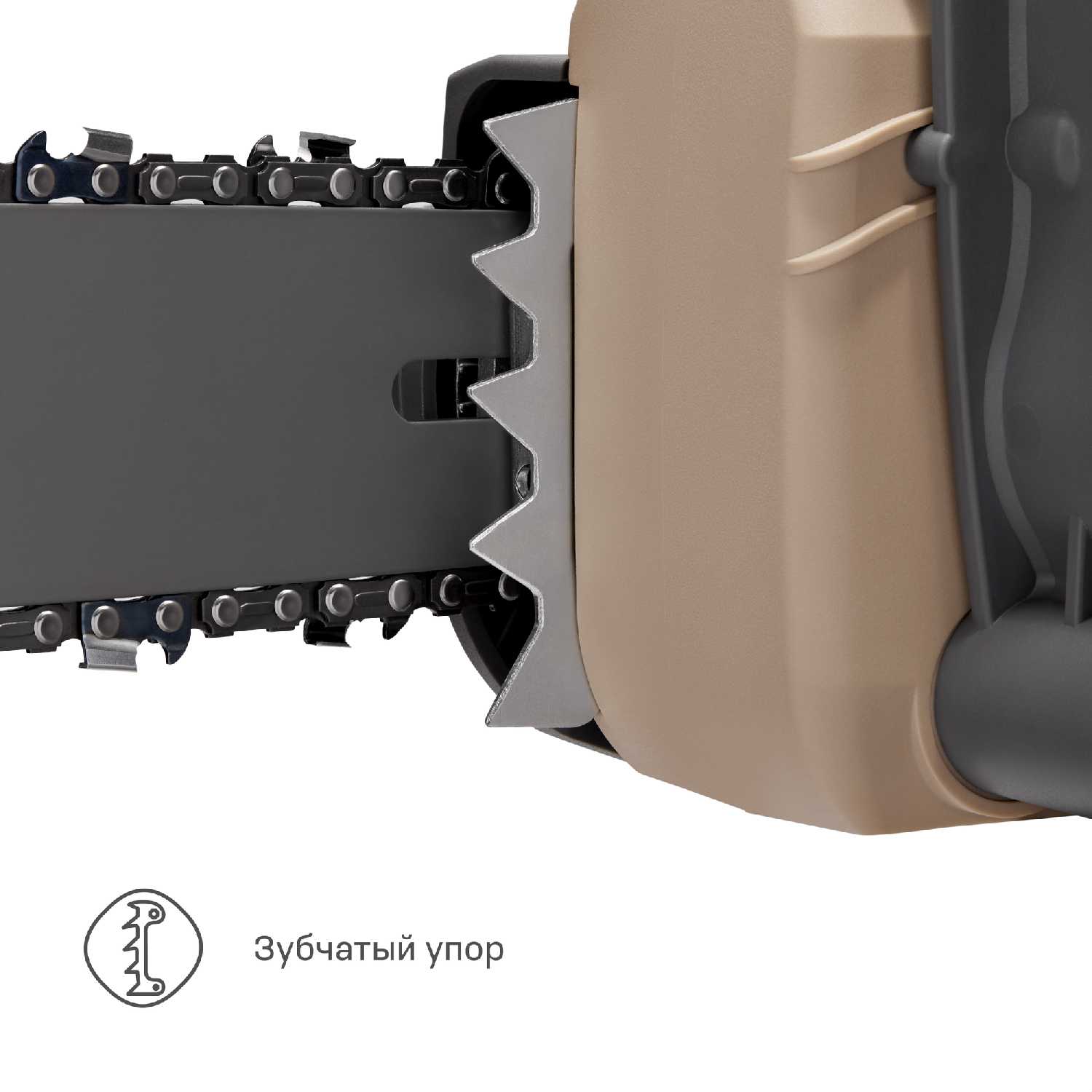 - Металлические направляющие шины с 4 упорными зубьями предотвращают застревание в плотной древесине.