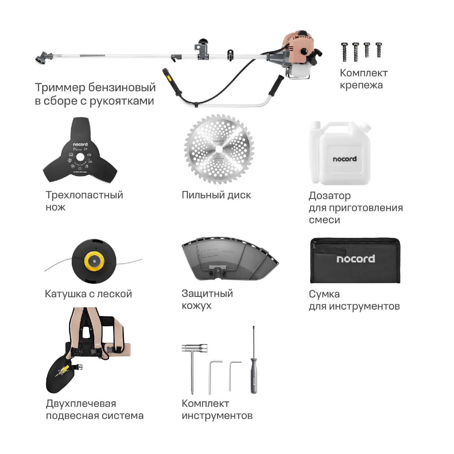 - Включает 3 насадки (катушка с леской, триммерный нож, диск для кустарника), мерную канистру для топлива, сумку для инструментов.