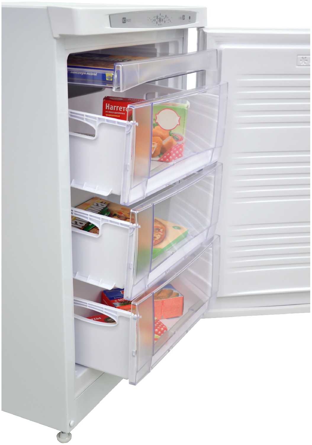- 4 вместительных выдвижных ящика + верхний лоток для быстрой заморозки мелких продуктов (пельмени, ягоды).