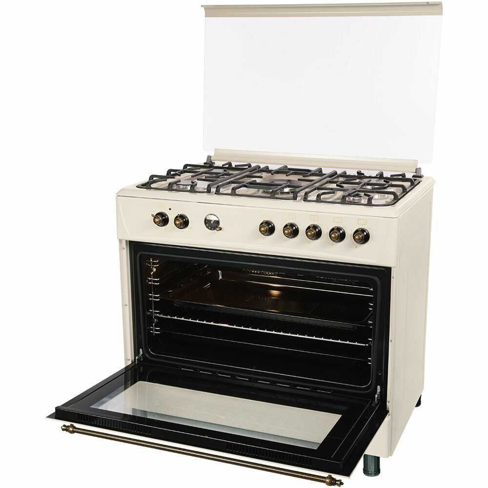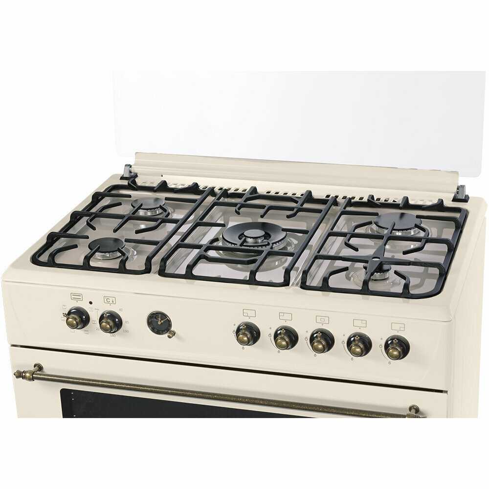| Особенности конструкции : | подсветка духовки, часы, чугунные решетки, эмаль легкой чистки, ящик для посуды |