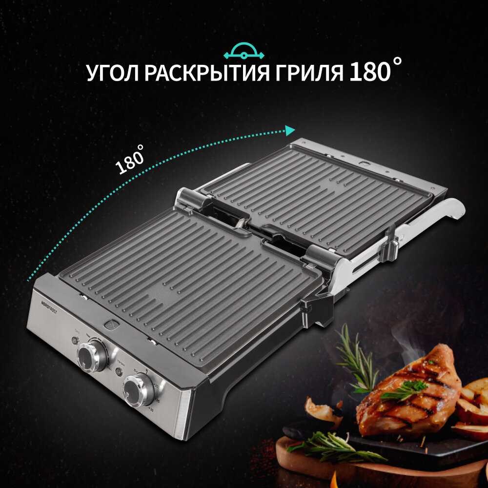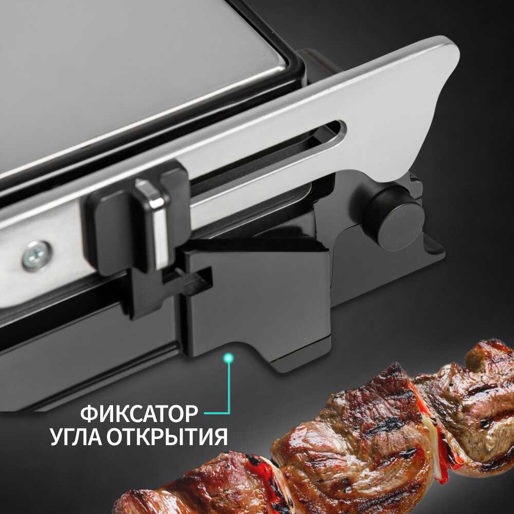 | Особенности : | антипригарное покрытие, контактный гриль, поддон для сбора жира, регулировка высоты верхней панели, съемные пластины |