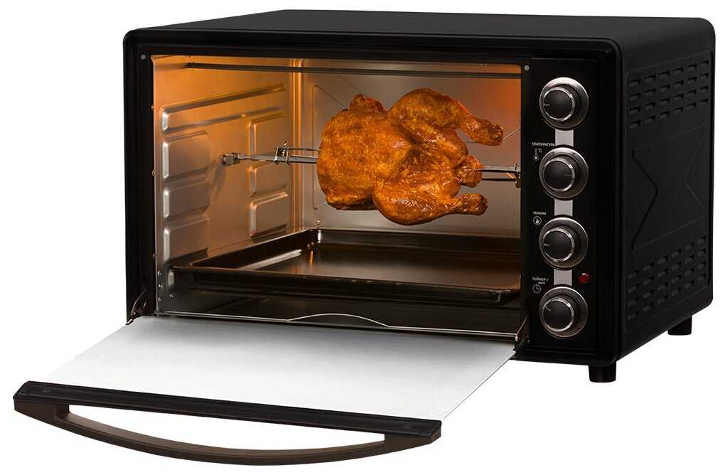 - Есть конвекция сбоку, крутящийся гриль, таймер с автоотключением и подсветка, что делает готовку удобной и контролируемой.