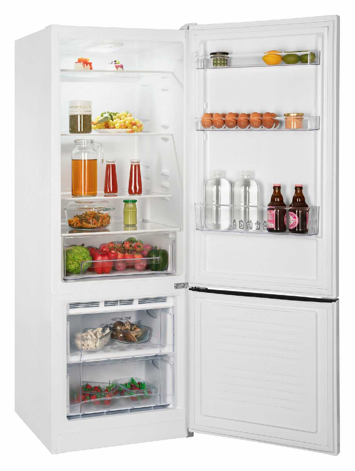 Полки изготовлены из прочного пластика, выдерживающего нагрузку до 5 кг, а контейнеры для овощей имеют бортики против протекания. Специальные ячейки для яиц (3 секции по 4 места) предотвращают бой при открывании дверцы. Морозильная камера оснащена двумя полноразмерными полками, оптимизированными для хранения запасов. -
