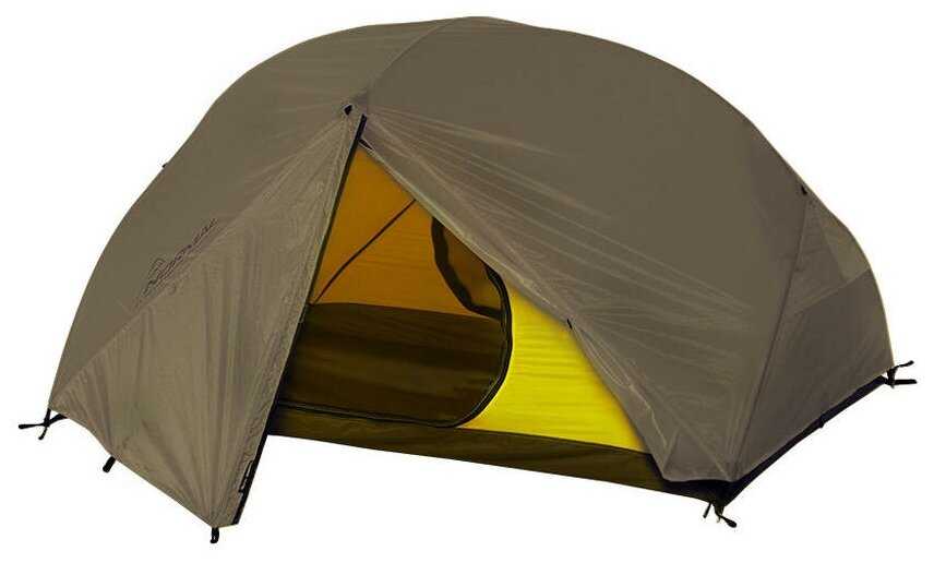Дно и тент плотные, фурнитура не рвётся и не заедает, алюминиевые дуги — класс! Дуга тамбура довольно длинная; она вставляется в дно и перекрывает переднюю часть дуг внутренней палатки крест-накрест, что делает всю конструкцию немного прочнее и устойчивее. Можно также установить тент на дуги без палатки, если ветер не страшен. Натяжение тента можно регулировать трёхщелёвками на ремешках угловых креплений. Для минимальной установки достаточно трёх-четырёх колышков — один-два для фиксации сзади и два для оттяжки тамбура спереди.