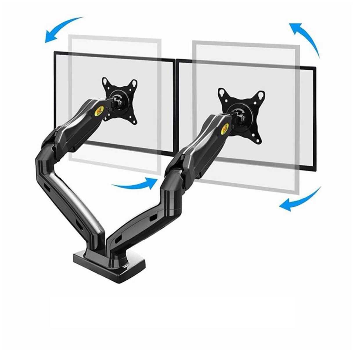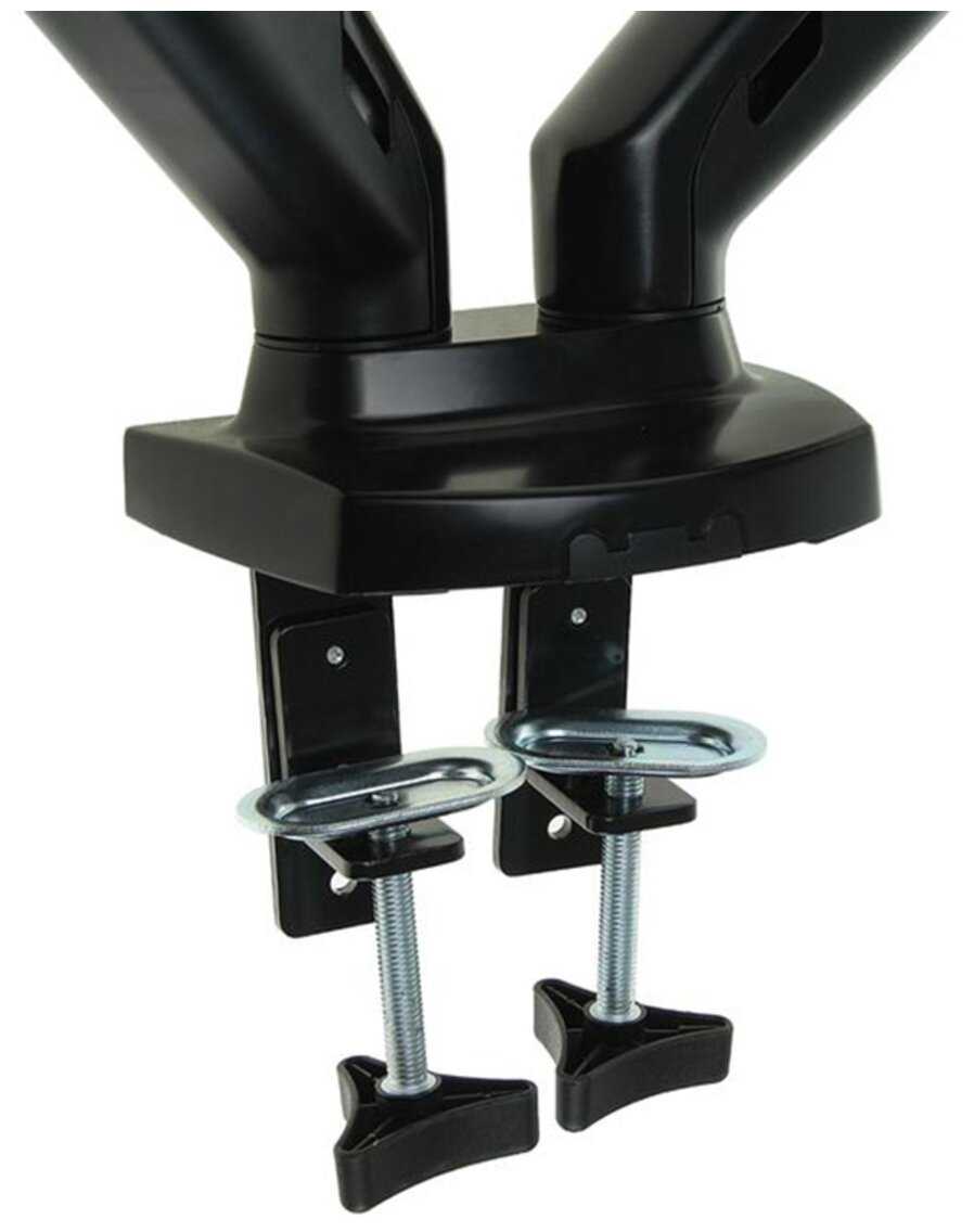 - + Отличный кронштейн для двух 27'' мониторов, можно крепить за край стола, можно сделать отверстие и через него. Можно провести провода USB, для подключения устройств...