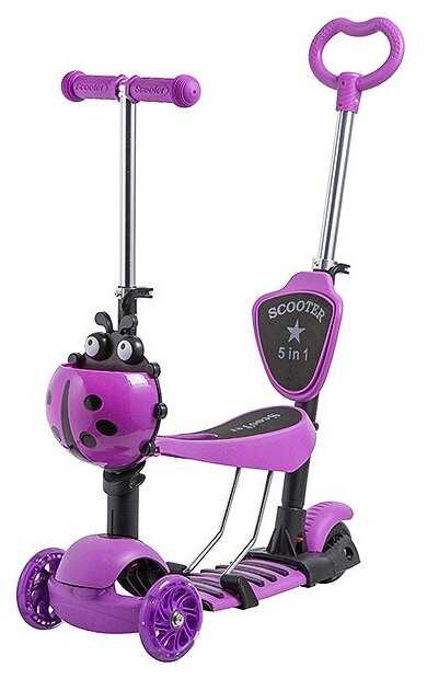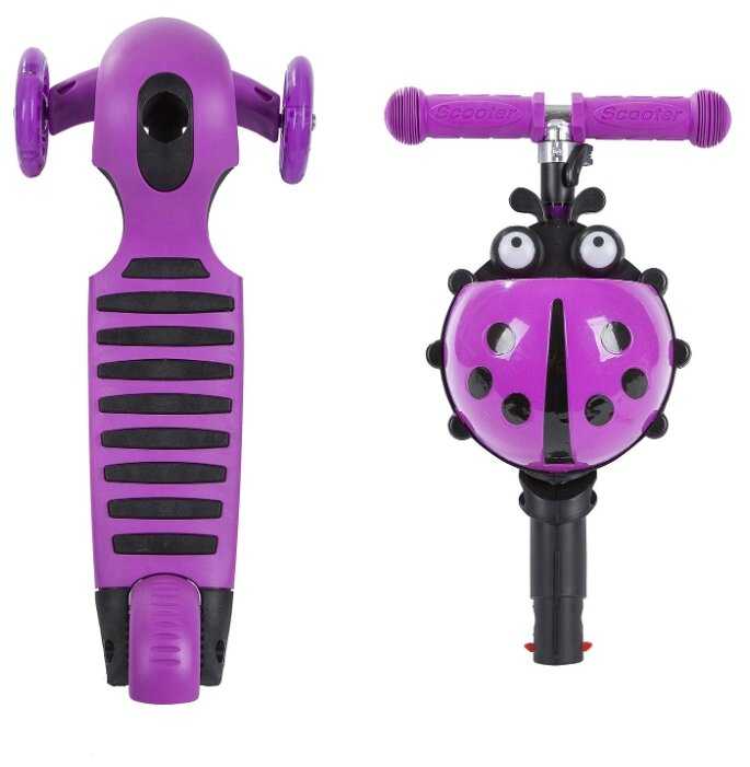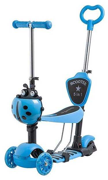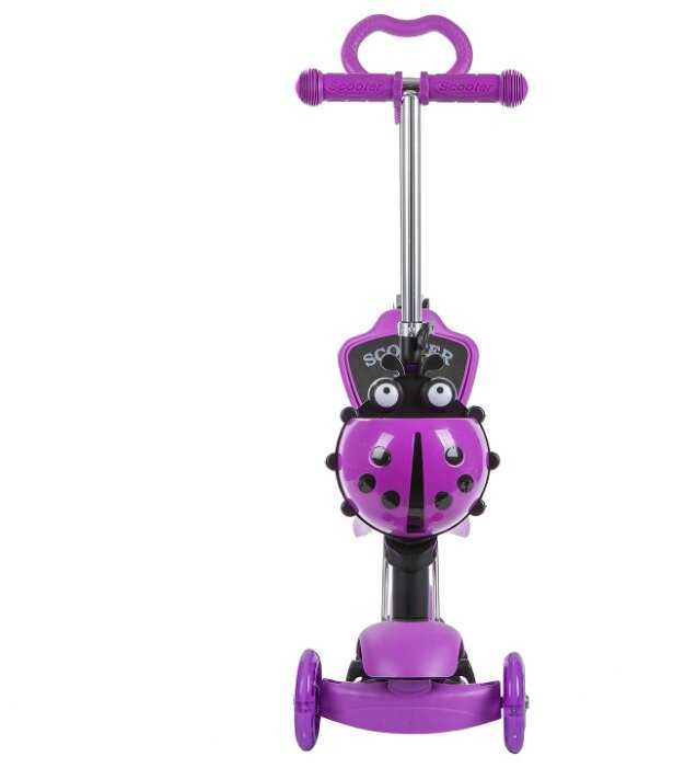 Самокат купили для малыша. У него есть и ручка, чтобы катить, и сиденье, чтобы малыш мог отдохнуть. Его сначала можно использовать как толокар, а потом убрать сиденье и ручку и в качестве самоката. Колеса светятся за счёт встроенных светодиодов. Самокат устойчивый, так как впереди есть два колеса, а не одно. Обе ручки имеют нескользкие резиновые накладки, так что держать их удобно. Впереди есть специальная корзинка в виде божьей коровки для хранения мелочей. Платформа широкая, для ребенка идеально. Он выдерживает нагрузку до 25 кг.