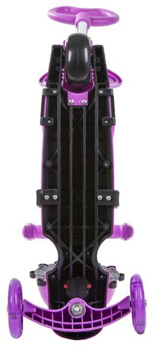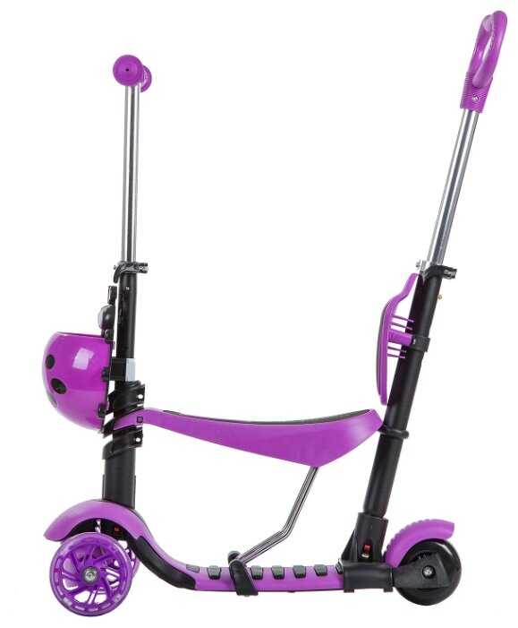 Яркий самокат нейтральной расцветки. Он подходит и для мальчика, и для девочки. У него есть вспомогательная родительская ручка для удобного перемещения сидящего малыша. Сиденье крепится к стойке и к платформе. Все это можно убрать, чтобы не мешало использовать его по прямому назначению. Конструкция многофункциональная. Руль можно поднять или опустить, зависит от роста ребенка. Сзади есть ножной тормоз, работающий безотказно. Колеса со встроенными светодиодами светятся, в темноте смотрится очень красиво.