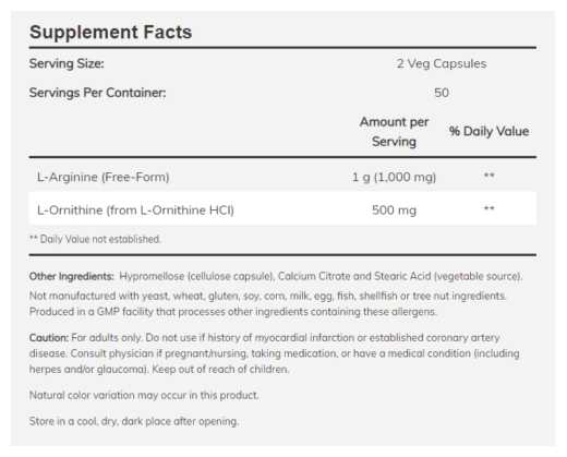 - Оптимальная концентрация: 500 мг L-орнитина + 500 мг L-аргинина на капсулу.
